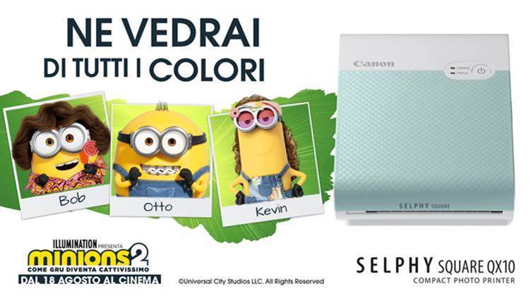 Canon sarà brand partner di Minions 2 – Come Gru diventa cattivissimo, l’atteso secondo episodio del film d’animazione dedicato agli amatissimi Minions nei cinema dal 18 agosto; l’iniziativa è nata grazie alla partnership con Wepromo – e Universal Pictures, distributore italiano della saga. Il nuovo episodio dedicato ai Minions debutta insieme a Canon SELPHY Square QX10, la stampante dalla forma quadrata, compatta, pratica e di alta qualità pensata per essere portata ovunque. Questa estate potrai non solo vivere esperienze e avventure uniche ma potrai anche ricordarle stampando dove vuoi in qualsiasi momento i tuoi ricordi.