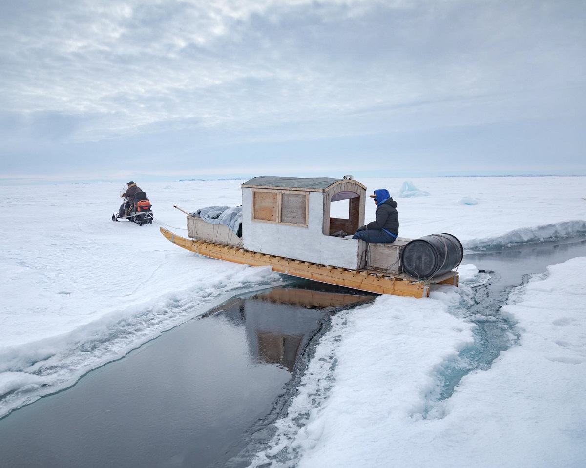 An open lead in the sea ice means a carefully orchestrated crossing for Olayuk Naqitarvik, pulling his grandson in a qamutik, or sled, packed with supplies for a family camping trip. Despite being ill and frail, Naqitarvik’s wife, Martha, insisted on taking part to relay her deep knowledge of living off the land to the next generations.