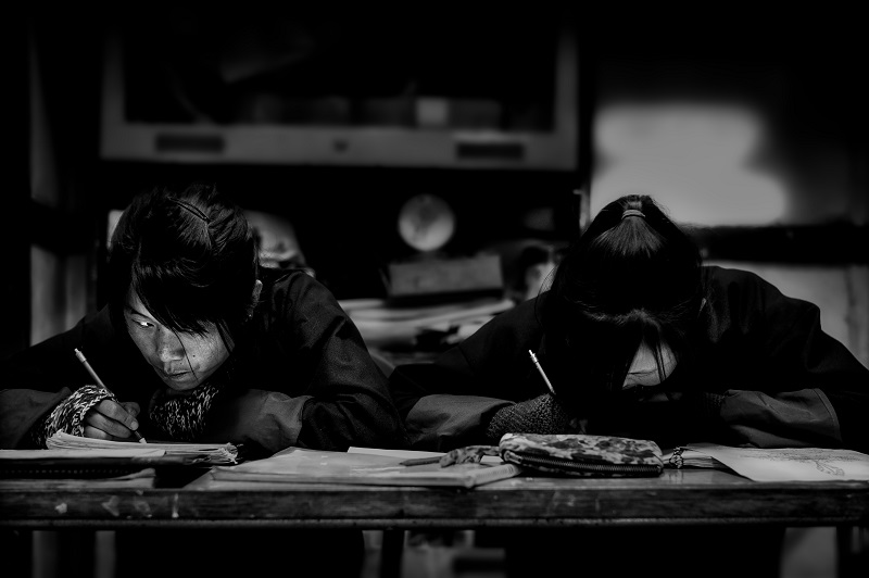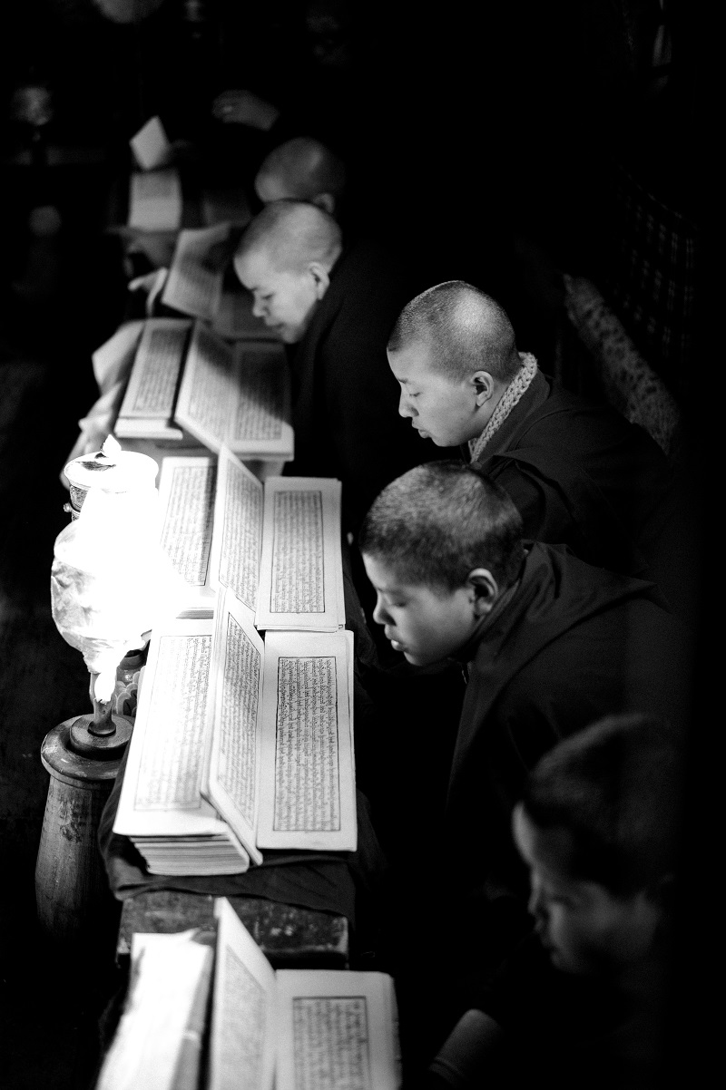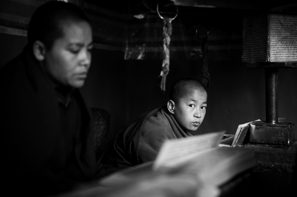 I due progetti sono stati realizzati parallelamente, come si può notare dal titolo delle due serie prodotte. L’intenzione era quella di rappresentare fotograficamente la differente identità di due popoli – quello nepalese e quello bhutanese – che hanno molti punti di divergenza. Il Bhutan ha mantenuto a lungo una severa politica isolazionista sia a livello culturale che nell’economia, nel tentativo di preservare la propria indipendenza. Le principali lingua parlate sono imparentate con il tibetano, indispensabile ai monaci per leggere ed approfondire lo studio dei libri antichi. Anche dal punto di vista fisico i bhutanesi sono molto più simili ai tibetani che ai nepalesi e volevo che ciò apparisse nella realizzazione dei due reportage. Nepal e Bhutan sono due entità profondamente diverse anche dal punto di vista religioso: nel primo la maggioranza è induista mentre il Bhutan è profondamente buddista, con oltre il 70% della popolazione che pratica questa filosofia di vita. I monaci si uniscono alla vita monastica sin da bambini, coltivando un modello di vita assolutamente austero e privo di ogni genere di lusso. Ciò è ancora più vero per i piccoli monaci che vivono nei monasteri racchiusi tra le montagne, dove la scarsa reperibilità di cibo e le condizioni climatiche avverse unite ad un abbigliamento spesso inadeguato ad affrontare i mesi più freddi dell’anno rendono ancora più dura la loro esistenza.