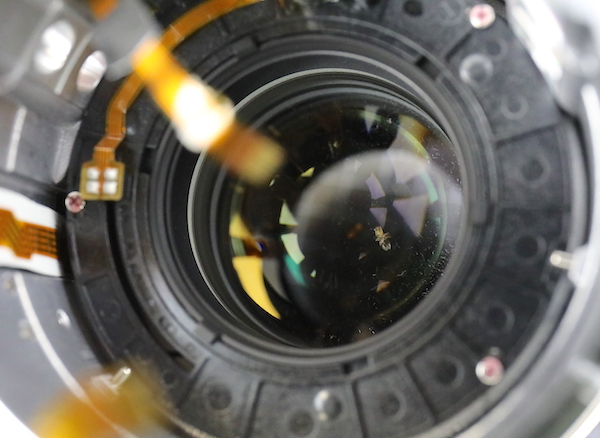 Da dove potrà mai essere entrata quella mosca ? Nell’articolo di Lens Rentals si fanno molte ipotesi, perchè passi l’ingresso della polvere che ha dimensioni davvero microscopiche, ma un intera mosca proprio non ha spazi in cui infilarsi. Eppure lei era li e allora sci scopre che, con quasi assoluta certezza, si possa essere infilata da una micro crepa presente nell’anello di ritenzione del gruppo lenti posteriore (quello visibile nella foto qui sotto). Ottimo lavoro dunque da parte del tecnico e da oggi in avanti, non preoccupatevi del granello di polvere che in ogni caso non inficia sulle vostre fotografie – in ogni caso se faremo togliere la polvere dai nostri obiettivi, saremo quasi certi che dalla settimana successiva ne troveremo dell’altra – una mosca no.