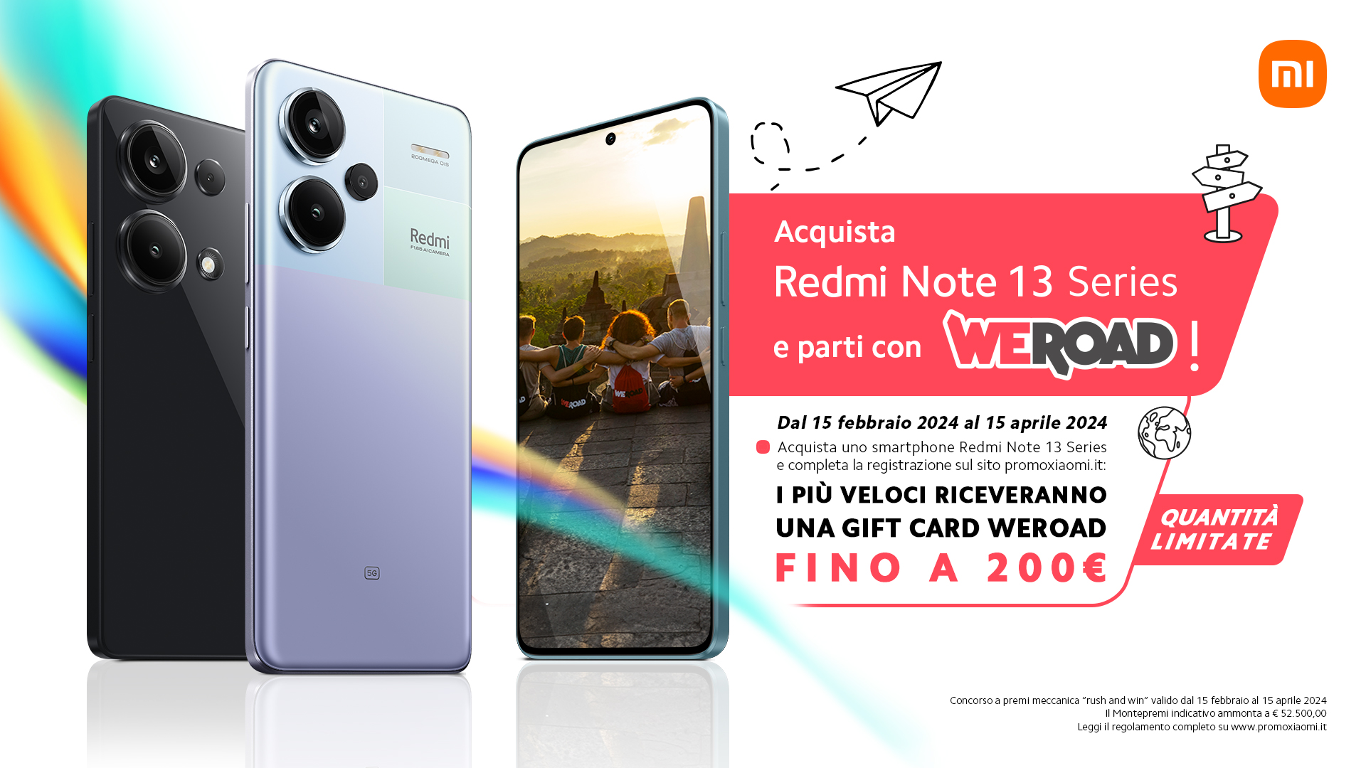 Da oggi e fino al 15 aprile 2024, acquistando uno degli smartphone Redmi Note 13 Series e caricando la prova d’acquisto sul sito www.promoxiaomi.it, i più veloci potranno riscattare una Gift Card – con validità fino al 30 settembre 2024 – per l’acquisto di un pacchetto viaggio WeRoad tra tutti quelli presenti sul sito www.weroad.it, fino ad esaurimento scorte.