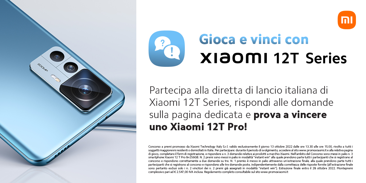 Estratto del regolamento: Concorso a premi promosso da Xiaomi Technology Italy S.r.l. valido esclusivamente il giorno 13 ottobre 2022 dalle ore 13.30 alle ore 15.00, rivolto a tutti i soggetti maggiorenni residenti o domiciliati in Italia. Per partecipare: durante il periodo di svolgimento, accedere al sito www.promoxiaomi.it e alla relativa pagina di gioco, completare il form di registrazione, e rispondere a n. 3 domande relative ai prodotti a marchio Xiaomi. Nell’ambito del Concorso sono messi in palio n. 3 smartphone Xiaomi 12 T Pro 8+256GB. N. 2 premi sono messi in palio in modalità “instant win” alla quale prendono parte tutti i partecipanti che si registrano al concorso e rispondono correttamente a due domande su tre. N. 1 premio è messo in palio attraverso un’estrazione finale, alla quale prendono parte tutti i partecipanti che si registrano al concorso e rispondono alle tre domande poste, indipendentemente dalla correttezza delle risposte fornite (all’estrazione finale sono pertanto esclusi solo i n. 2 vincitori dei n. 2 premi già assegnati in modalità “instant win”). Estrazione finale entro il 28 ottobre 2022. Montepremi complessivo pari ad € 2.547,00 IVA inclusa. Regolamento completo consultabile sul sito www.promoxiaomi.it